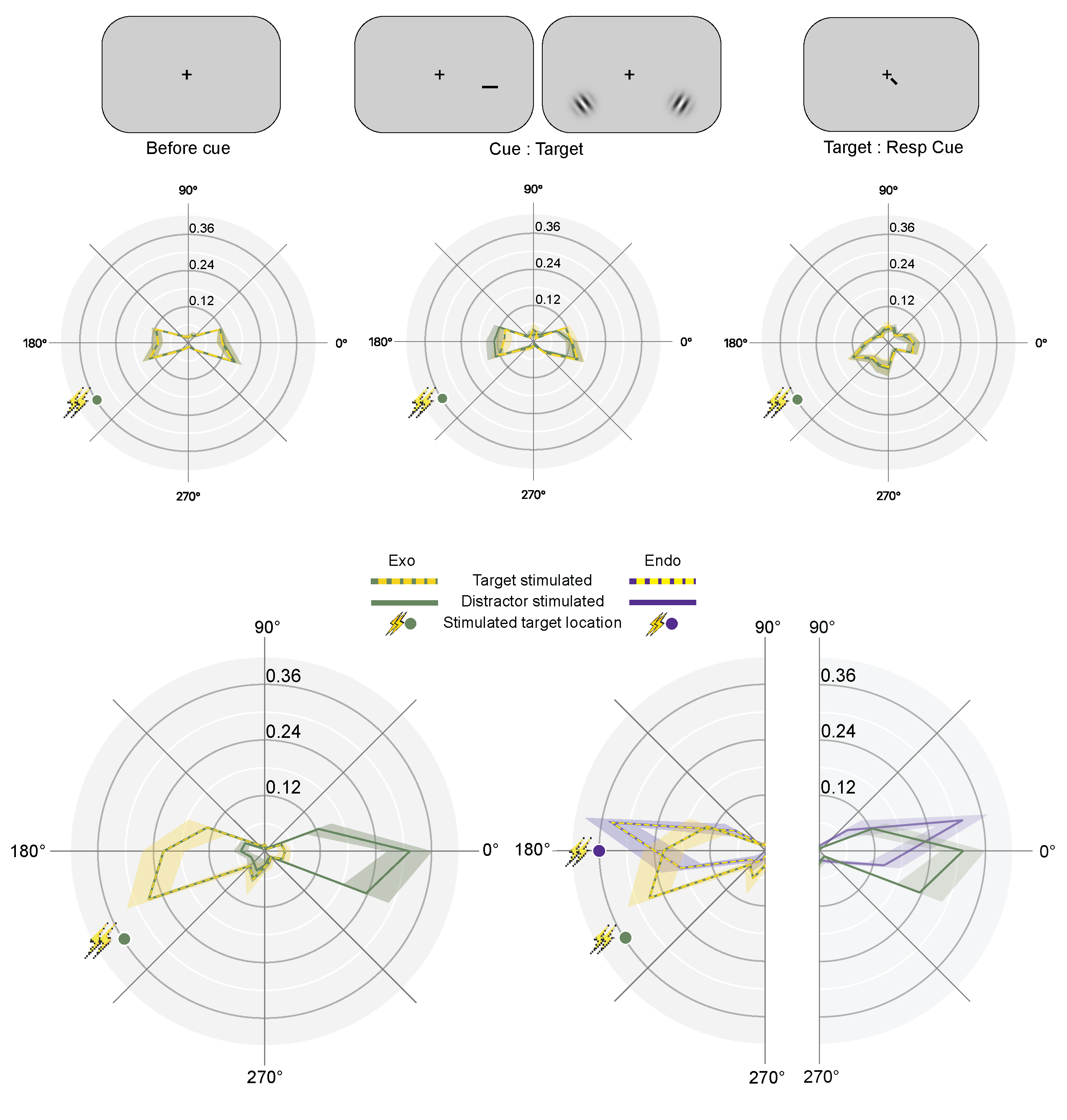 Upper panel: Normalized group-averaged polar angle microsaccade frequency before the cue (left panel), from cue onset to target onset (middle panel), and between target onset and response cue (right panel). Lower panel: Normalized group-averaged polar angle microsaccade frequency after response cue onset (up to response) following rFEF+ TMS, split for target location (target-stimulated and distractor-stimulated conditions); current rFEF+ Exo data (left panel) and comparison with rFEF+ Endo data reported in Fernández, Hanning & Carrasco (2023) (right panel). Dots indicate target location in stimulated hemifield (green: Exo rFEF+; purple: Endo rFEF+). Colored, shaded areas in all panels indicate ±1 SEM.